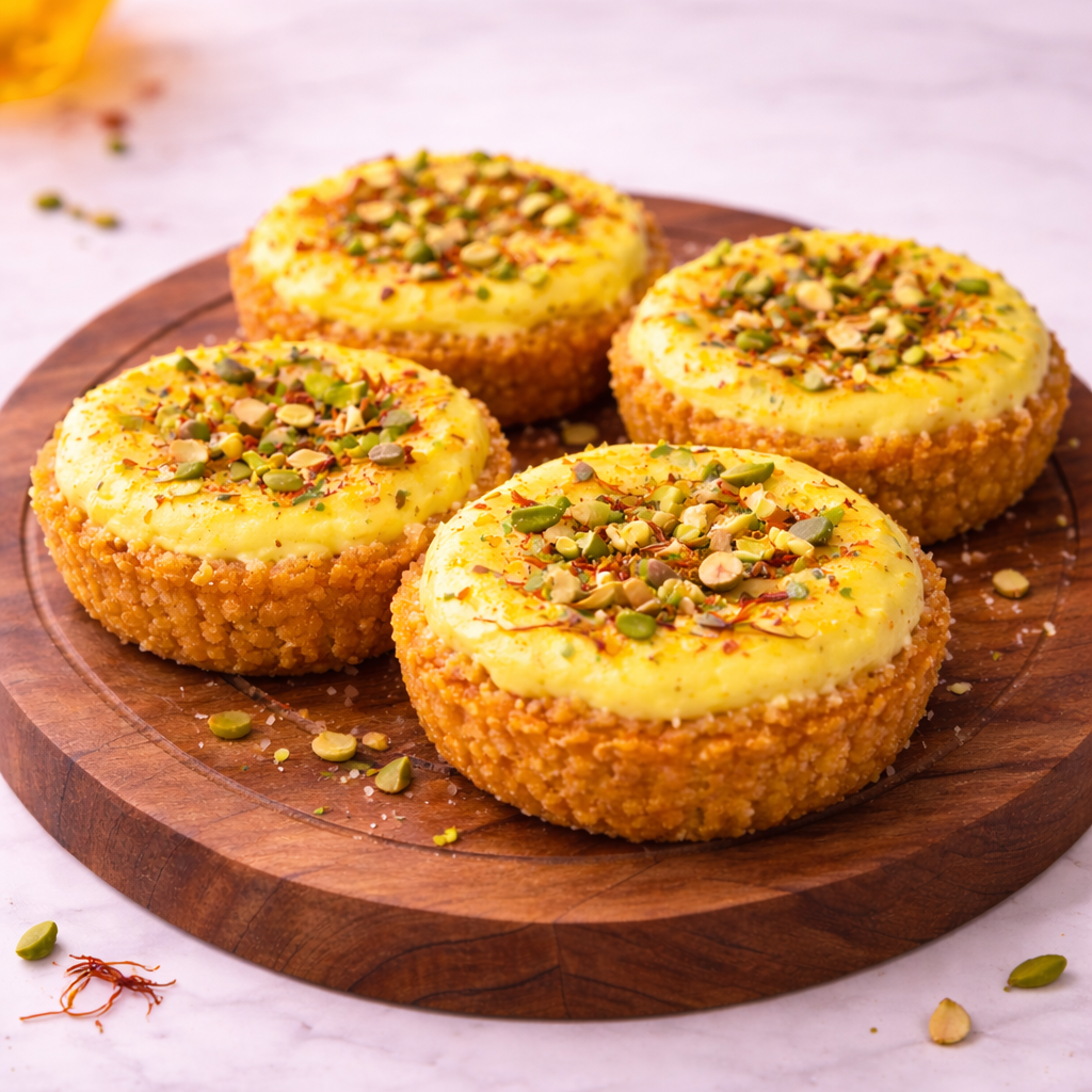 Relish the rich and festive taste of Kesar Ghewar, a traditional Rajasthani sweet known for its crispy honeycomb texture and aromatic saffron flavor. Prepared with refined flour and pure ghee, soaked in light sugar syrup, and infused with premium kesar (saffron), this delicacy offers a royal taste in every bite.